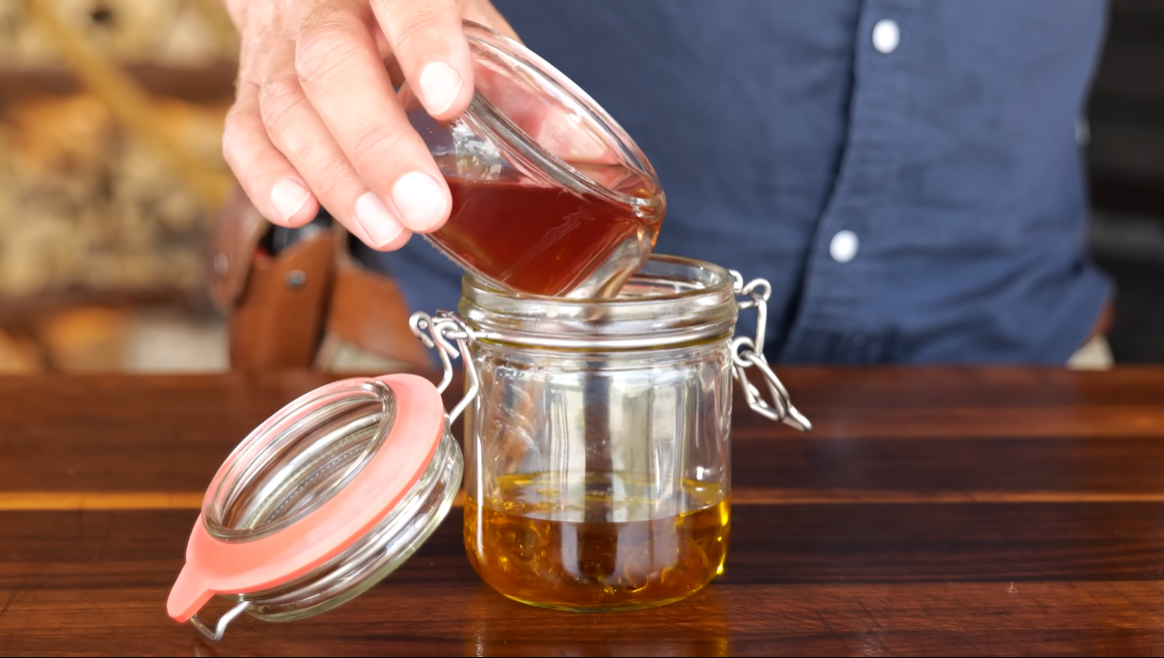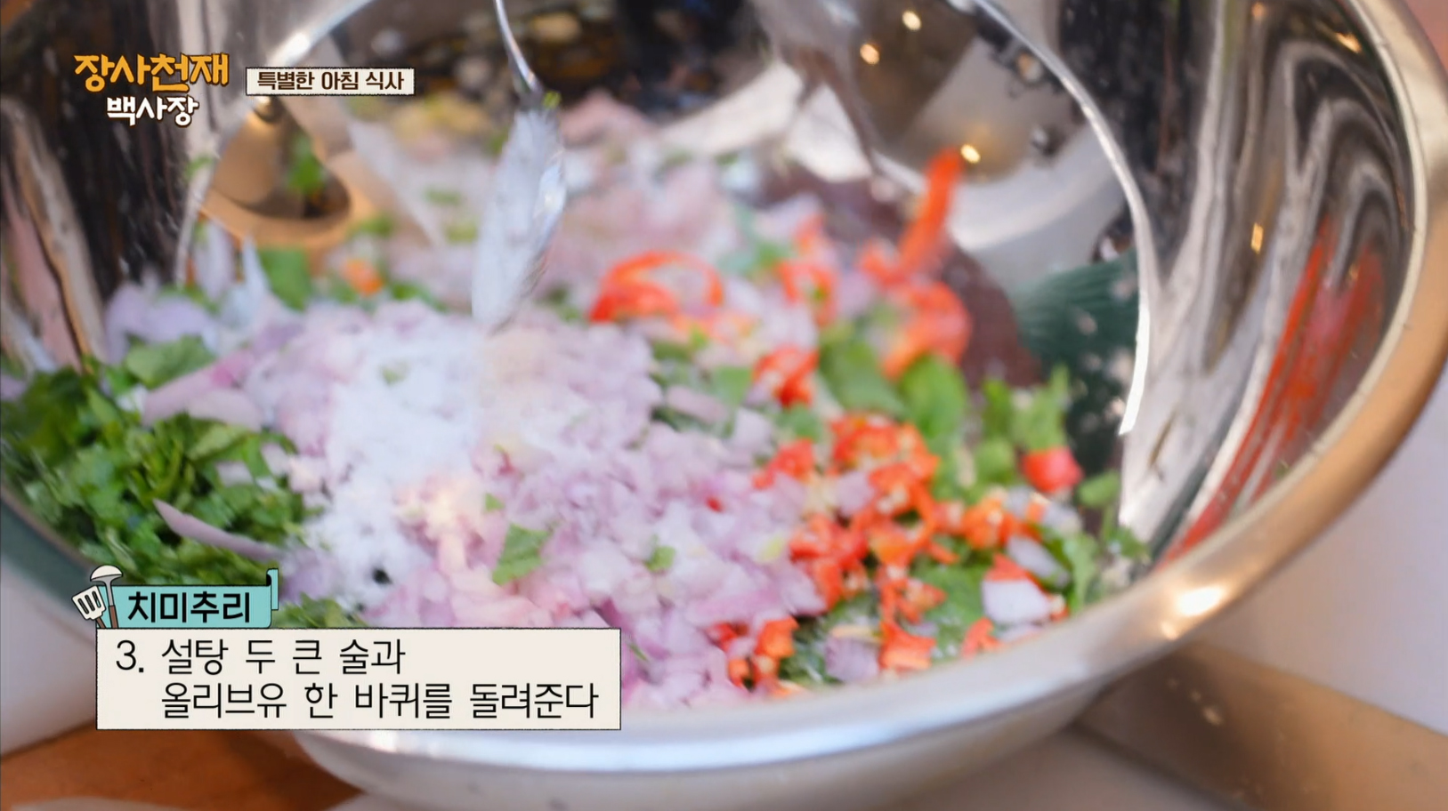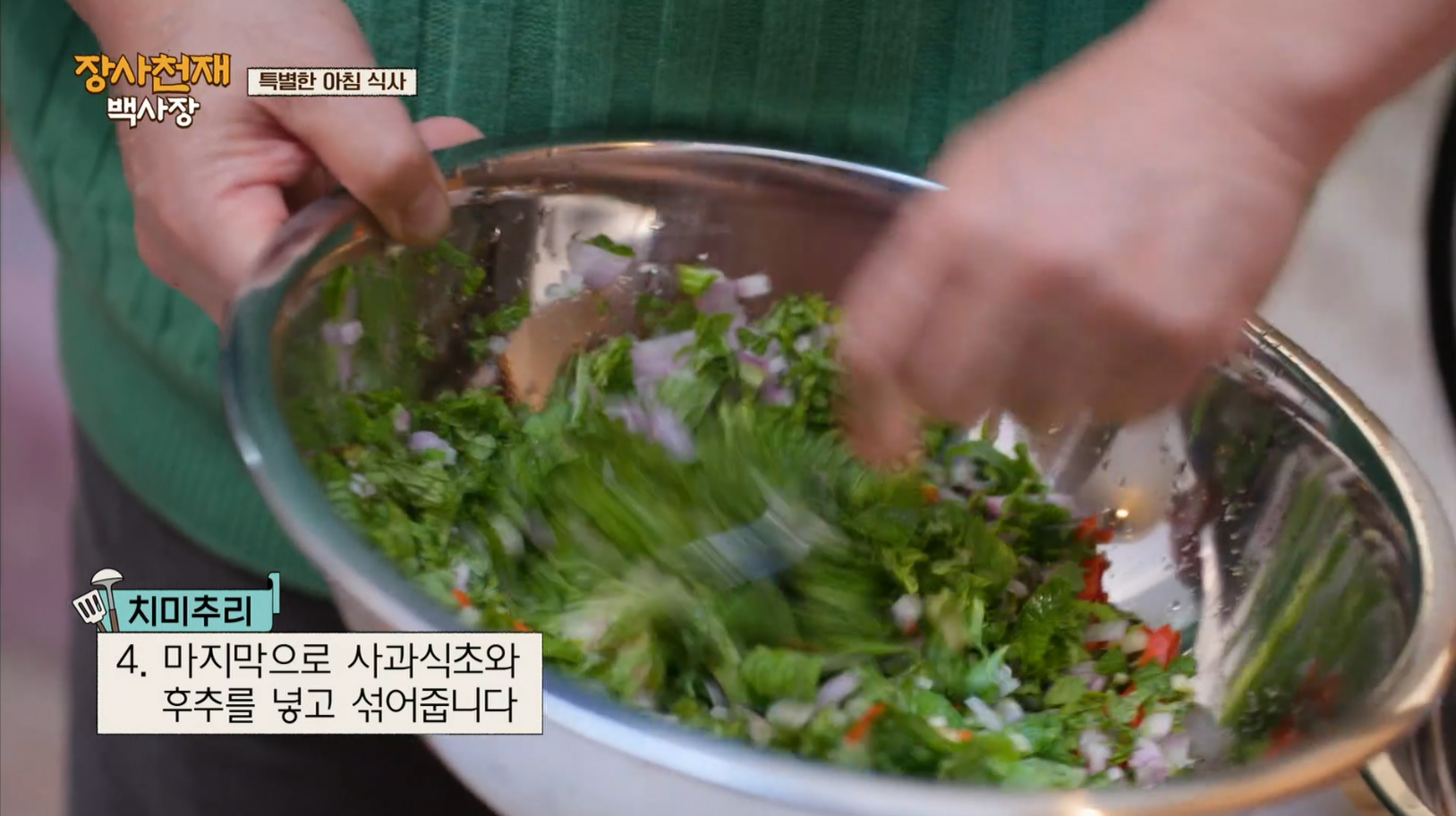 백종원의 치미추리 레시피: 애플민트, 홍고추, 양파를 잘게 다지고 설탕 2개, 올리브유 1개, 사과식초, 후추를 넣고 흔든다.