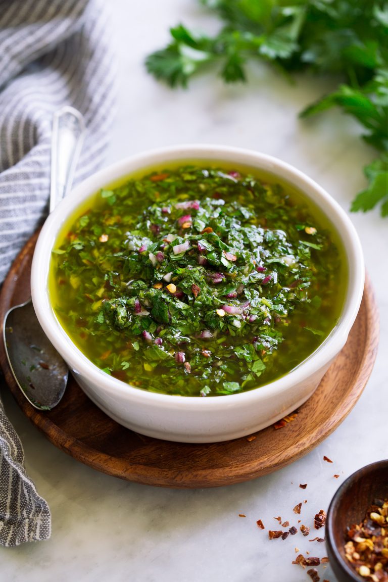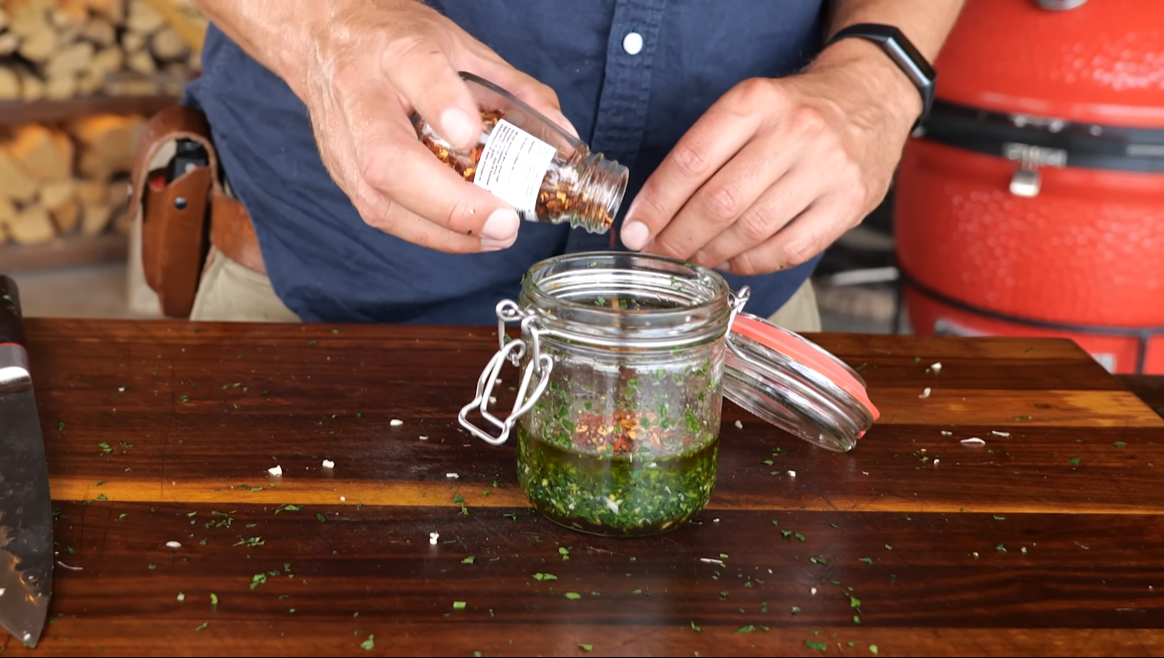 Chimichurri는 스테이크와 함께 먹는 허브와 향신료의 혼합물로 만든 아르헨티나 소스입니다.