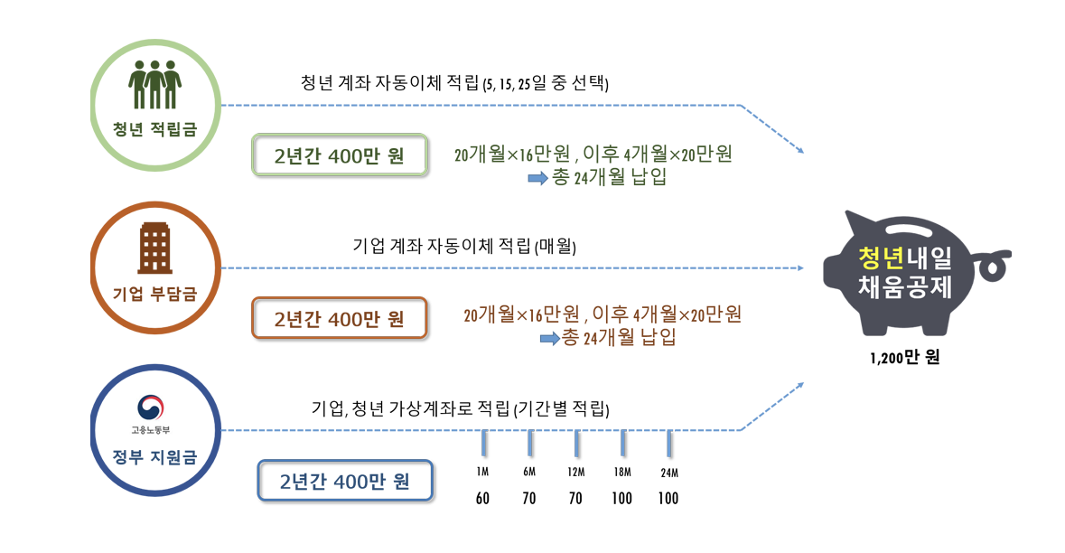 청년 2년간 400만원 적금 + 기업 2년간 400만원 적금 + 정부 2년간 400만원 적금 = 2년 만기 1,200만원