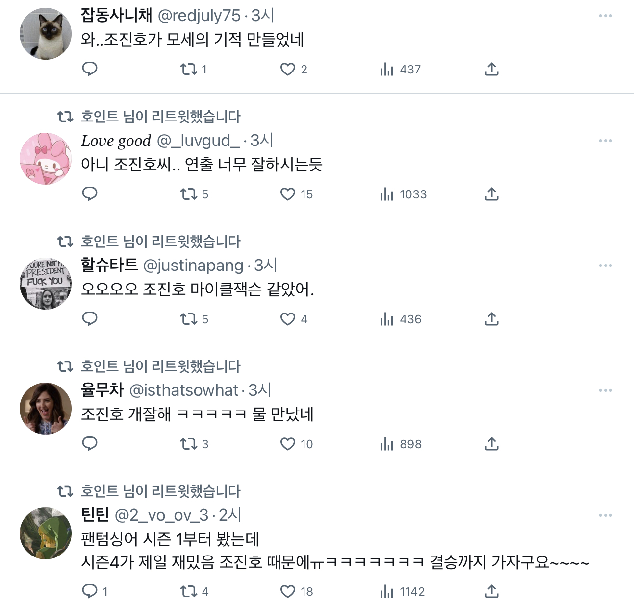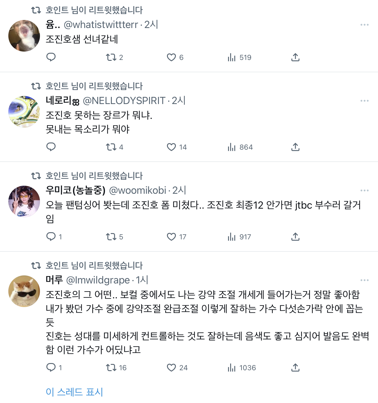 진호 형은 가면 갈수록 자신의 능력과 실력을 아낌없이 뽐내는 것 같아서 정말 좋아요.