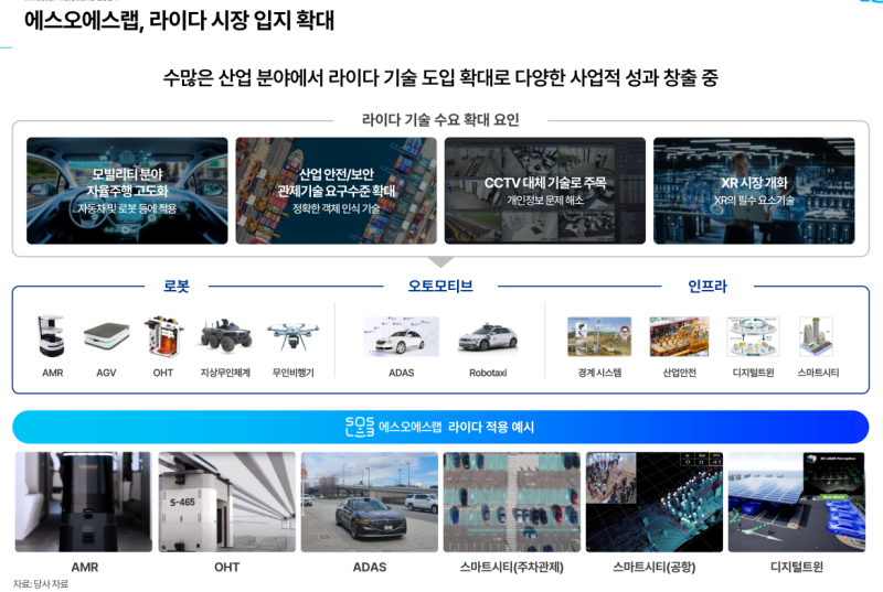 SOS Lab은 LiDAR 기술 전문 기업입니다. LiDAR는 빛(광원)을 방출하여 위치와 거리를 측정하는 기술을 말하며, 주요 용도로는 자율주행 등 다양한 분야에 걸쳐 사용됩니다.